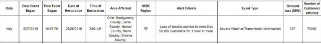 Here is an example of what it looks like to us. On May 27, 2019 tornadoes and thunderstorms hit the Dayton Ohio area causing destruction and over 68,000 customers lost power. Here is what the publicly available OE-417 entry looks like: