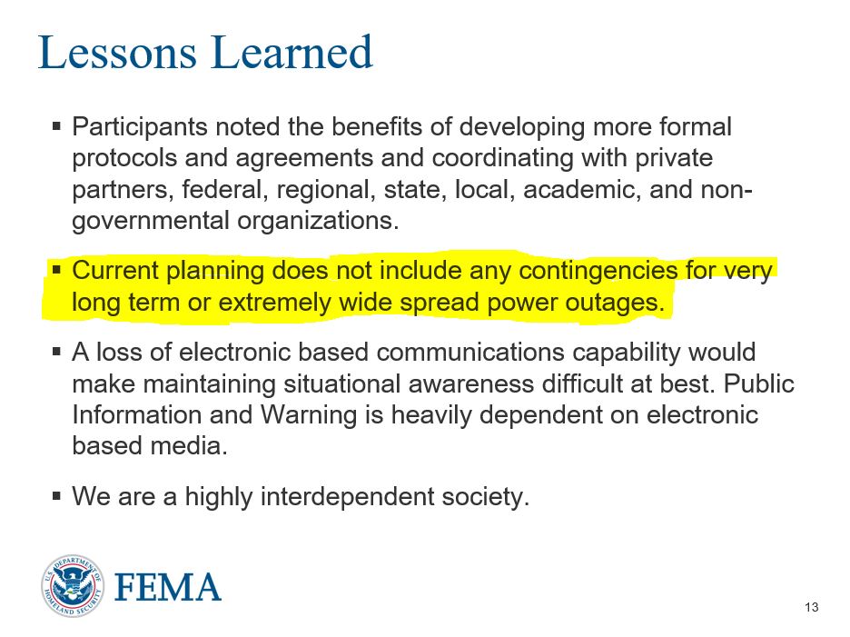 “Current planning does not include any contingencies for very long term or extremely wide spread power outages.” -FEMA