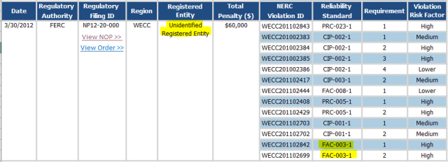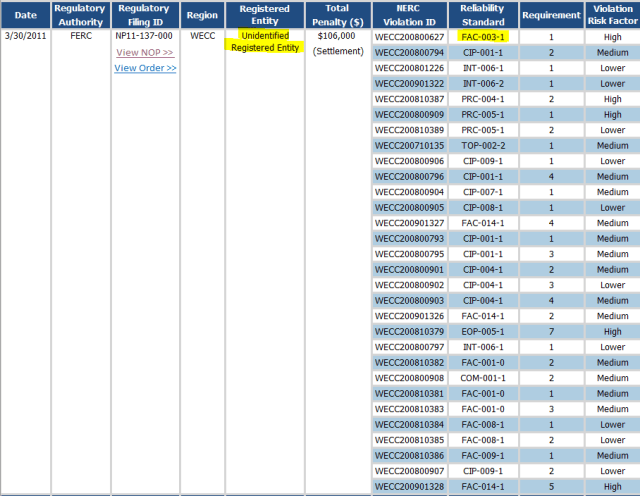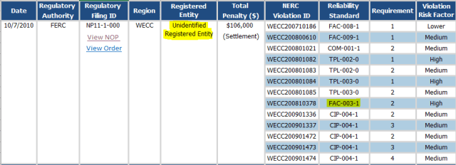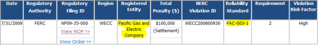 So, as you can see, Pacific Gas and Electric (PG&E) was fined $100,000 on July 31, 2009 for violating the transmission vegetation management standard - then FAC-003-1. But at least, at the time, this information was disclosed to the public.